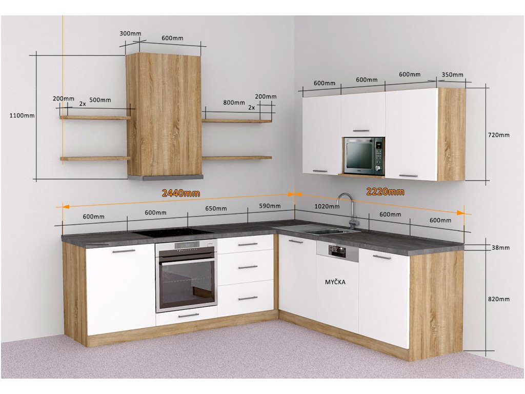 Podrobné rozmery kuchyne sú uvedené na obrázku