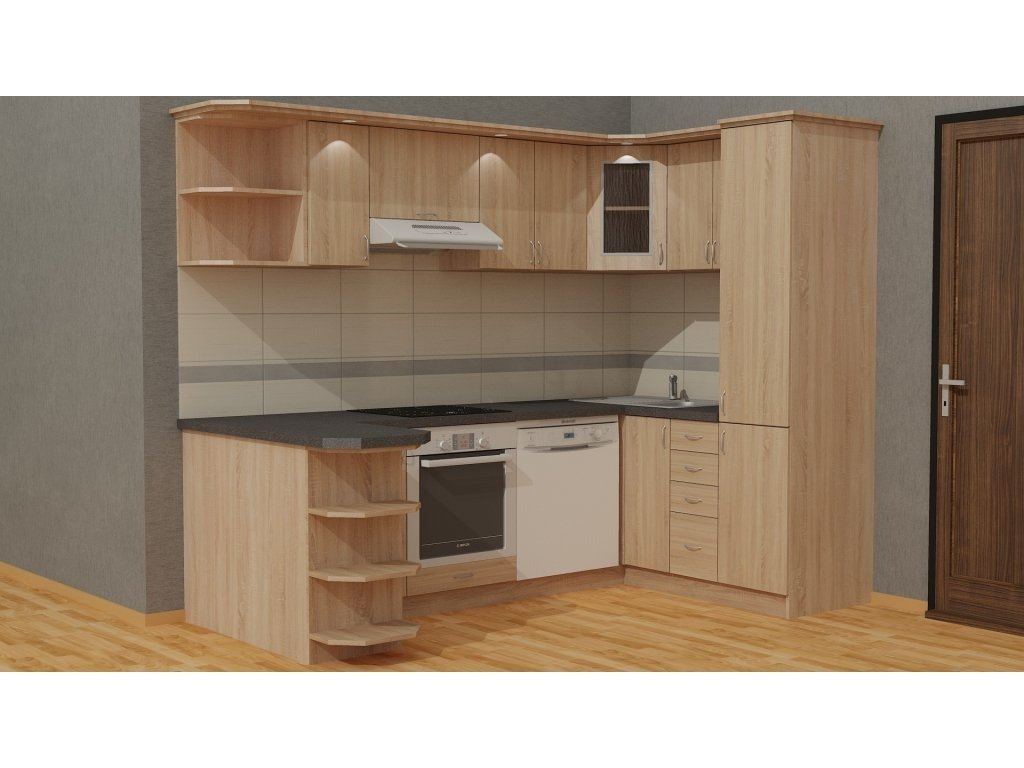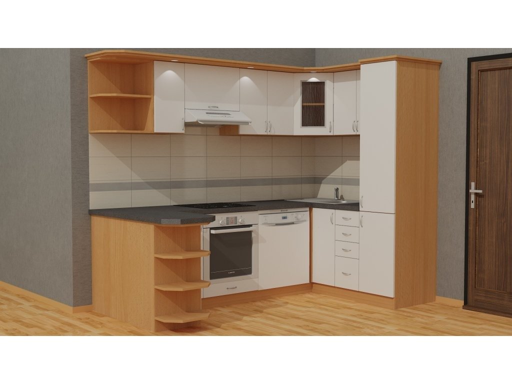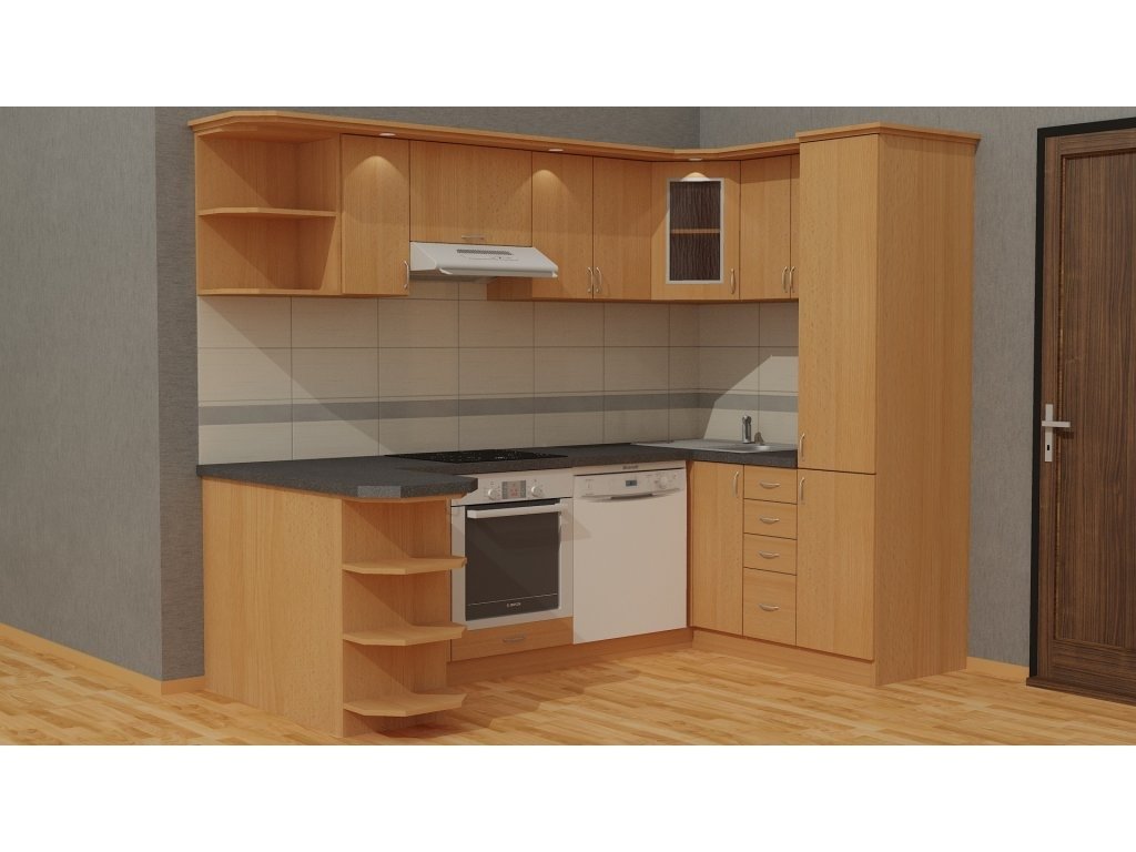 - korpusy jednotlivých skriniek sú zložené na nastavovacích nožičkách - odnímateľný sokel, použitý materiál lamino, tl. 18 mm, plastová hrana 0,6 mm, skrinky sú vrátane dvierok