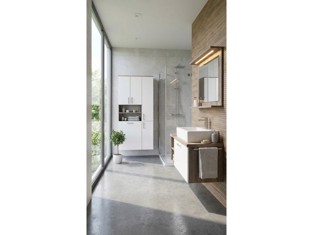 S našou závesnou kúpeľňovou skrinkou budete mať všetko prehľadne usporiadané a po ruke, kedykoľvek to budete potrebovať. Vďaka šikovnému dizajnu s otvorenými policami a veľkou uzavretou policou zostane vaša kozmetika a uteráky vždy usporiadané a ľahko dostupné.