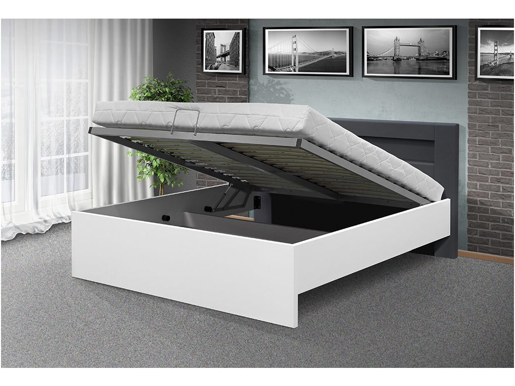 Konštrukciu postele tvoria masivne diely korpusu z 36mm lamina a čelo dekoruje šedá eko koža. Všetko je pevne spojené kovaním. Konštrukcia pelesti je kovová, opatrená lamelovým roštom (otváranie od nôh). Do postele je možné použiť všetky typy matracov, viď ponuka nižšie. Posteľ má vysokú plochu na ležanie a vysoké pevné čelo.