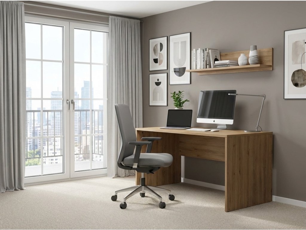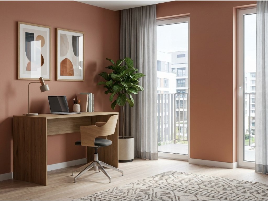 Jednoduchý písací stôl, ktorý sa hodí do študentskej izby, uzavretej pracovne, alebo aj open space kancelárie. V oboch rohoch pracovnej dosky stola sú priechodky na elektrické káble. Boky a pracovná doska stola sú spevnené masívnou zadnou doskou.